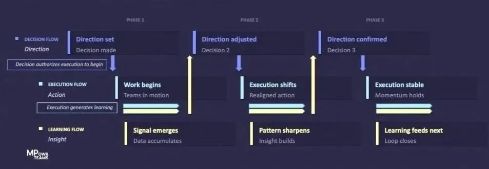 Every initiative runs Decision, Execution, and Learning flows simultaneously, repeating at every material decision point, not just named phase transitions.
